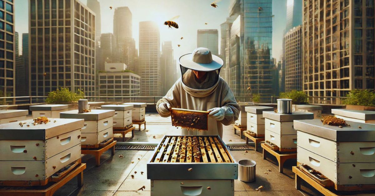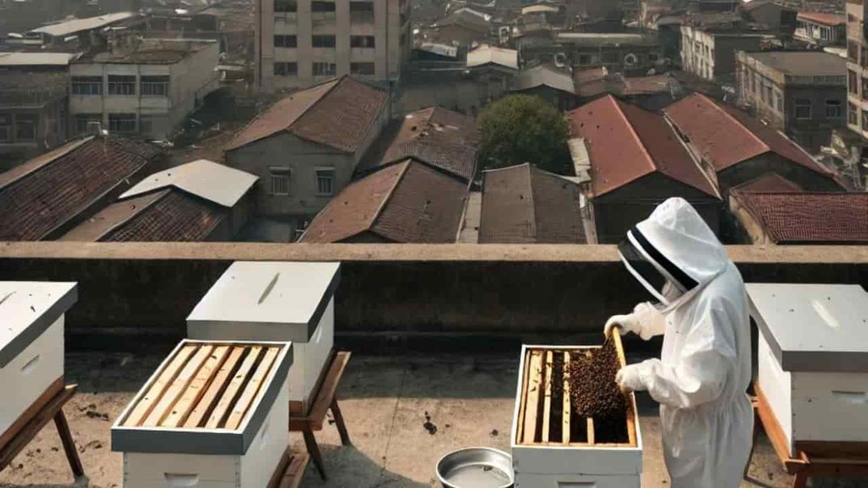 Urban beekeeping means keeping bee colonies in cities. People use gardens and rooftops for this. It’s part of urban agriculture. Urban beekeeping helps bees and the city. Bees pollinate plants, which is good for nature in cities.